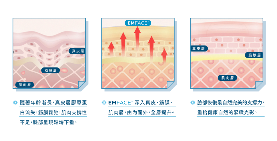 EMFACE菲斯波以劃時代科技深層刺激肌肉層,達到臉部輪廓線條上提及改善高低眉、臉部表情不對稱等問題;以非侵入式高強度電場技術 (HIFES)結合單極電波 (Synchronized RF),能同時針對肌肉與皮膚層治療,以雙重能量搭配,從臉部肌肉結構與筋膜深層強化,從而鞏固支撐臉部皮膚組織,改善皮膚紋理和光滑度。 其中,EMFACE菲斯波高強度電場技術 (HIFES)突破傳統治療深度能從底層增加肌肉密度,同時拉緊筋膜層,刺激膠原蛋白增生,由內而外重塑臉部輪廓。