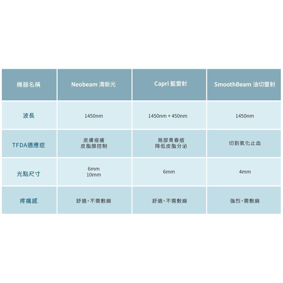 A:清新光主要是改善「皮脂腺分泌過多」的相關問題,適合各種類型的痘痘和膚質。若有以下肌膚困擾,都可以請專業醫師評估。